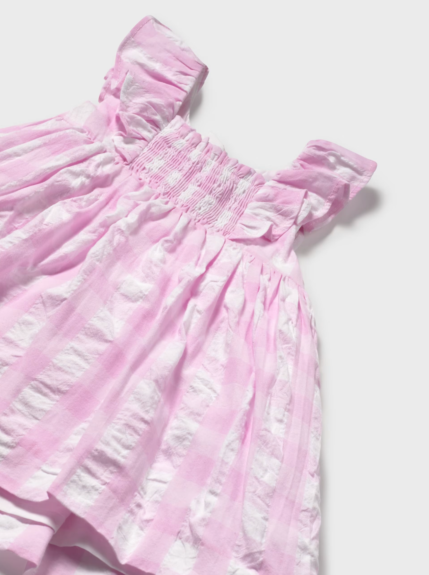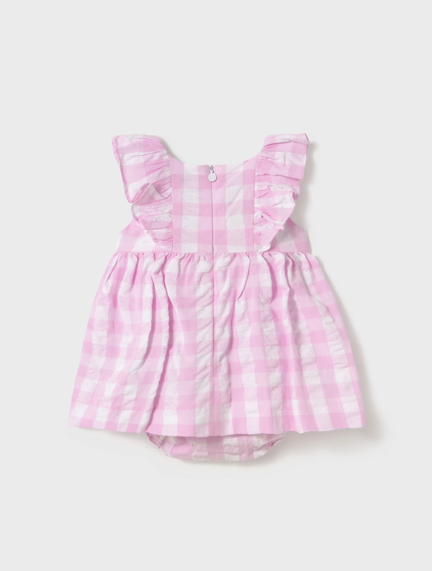 Dress with straps and ruffles for baby. Opening on the back with an invisible zip. Includes an inner lining. This model has honeycomb detailing. Guingham pattern.