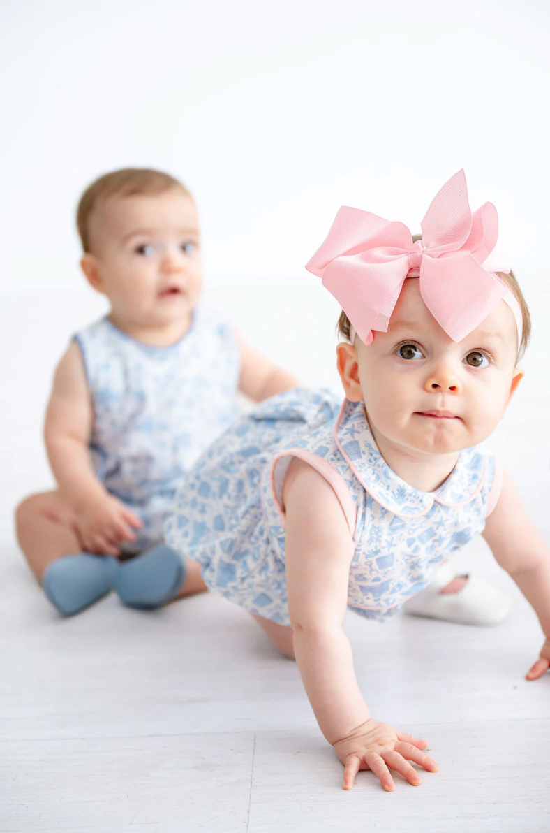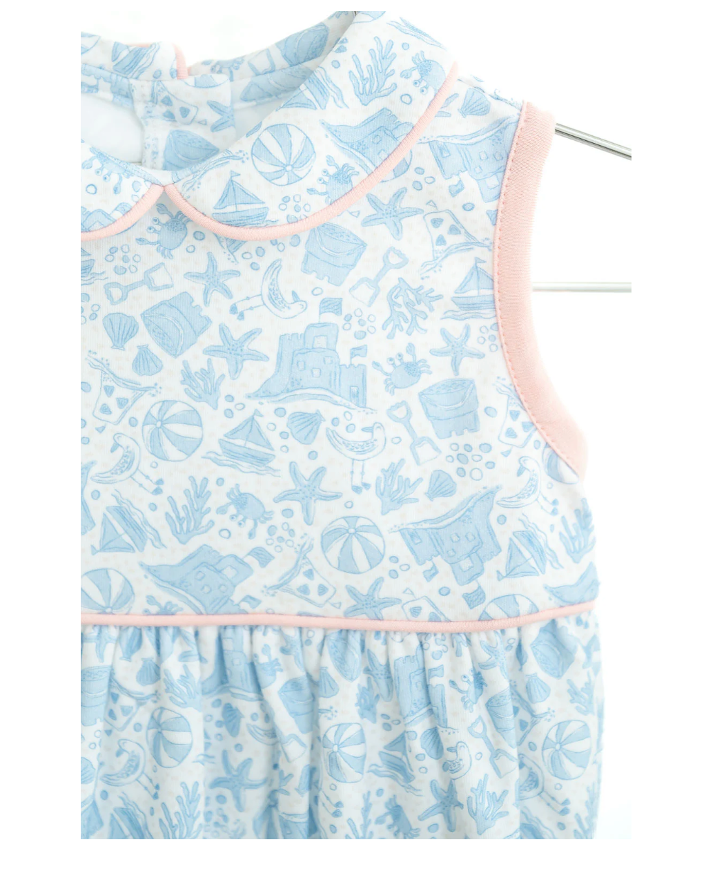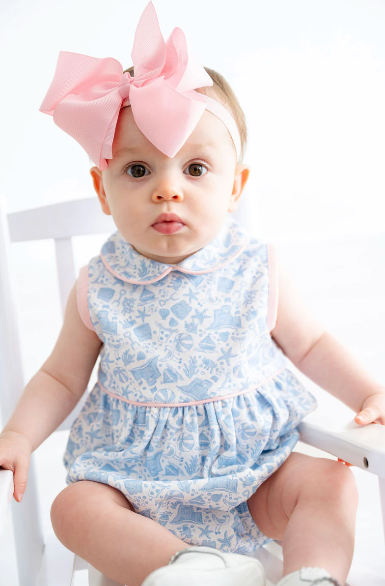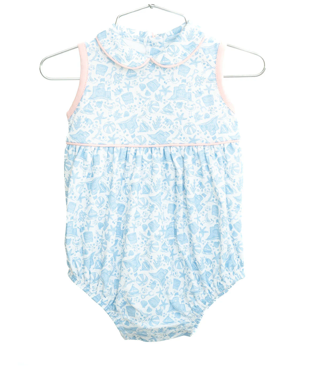 The Blue Pima Beach Motif Bubble is a sweet and timeless one-piece for newborn and baby girls. Made from 100% soft Pima cotton, this bubble features light pink piping details and a charming beach-inspired motif.