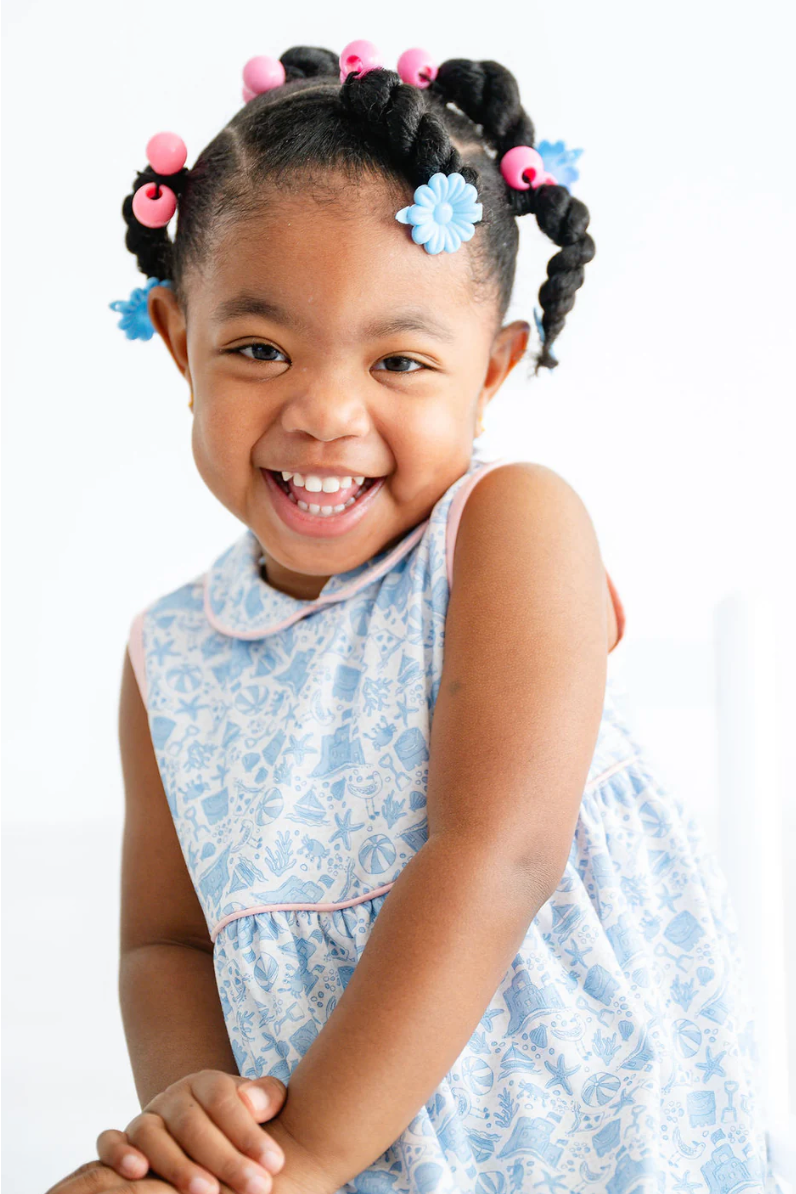 The Blue Pima Beach Motif Dress is a classic and charming dress for toddler and little girls. Crafted from 100% soft Pima cotton, this breathable and comfortable dress features a playful blue beach-inspired motif accented with light pink piping.