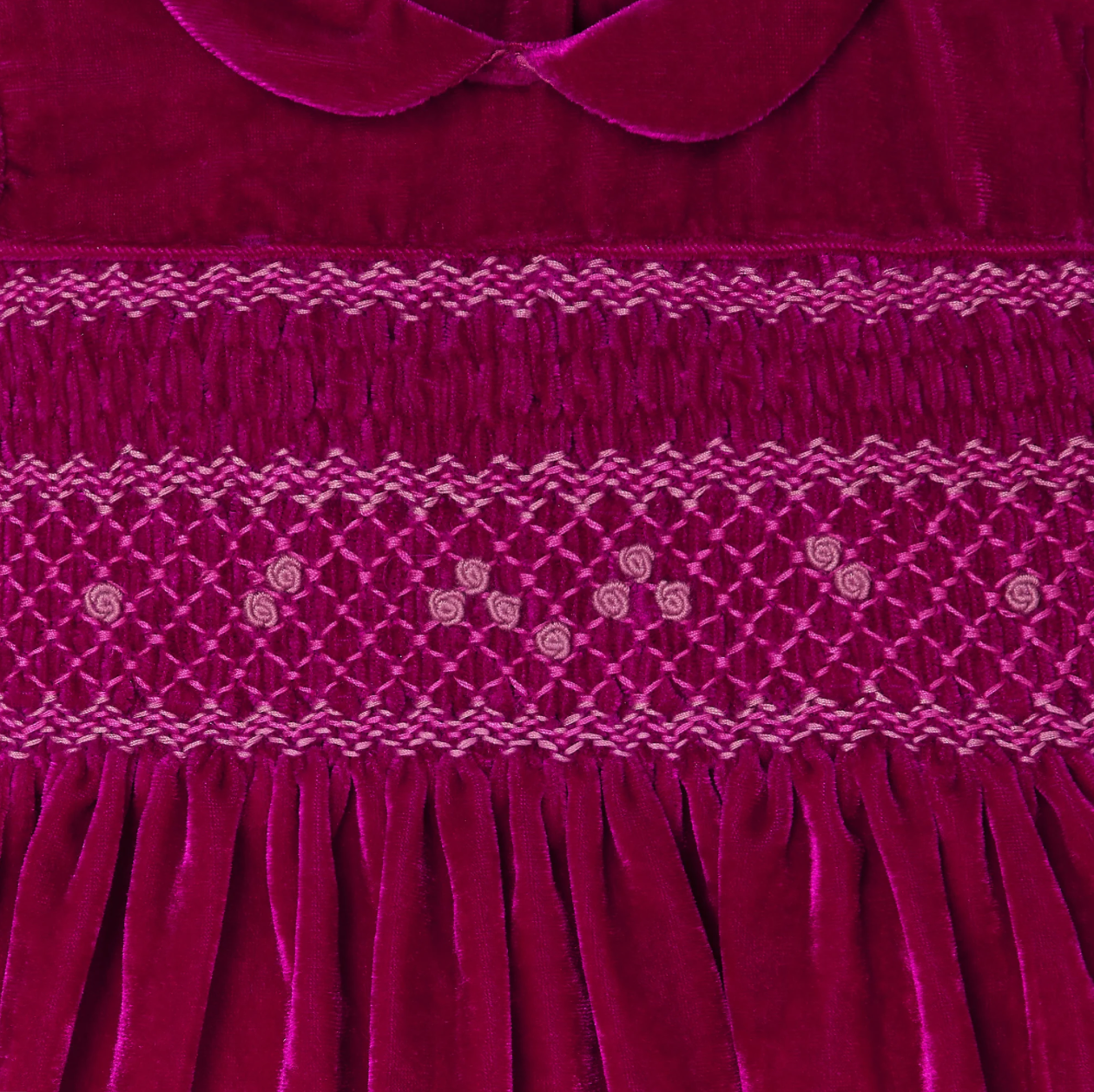 Meet Bellatrix, our deep pink velvet party dress for girls. Made from the softest, shiniest velvet, it features intricate hand-smocking across the bodice that adds a touch of sophistication. The timeless Peter Pan collar adds classic charm, while the dress ties at the back with a pretty bow for an adjustable, perfect fit. Fully lined with cotton for extra comfort, this dress is designed to make your little one feel fabulous at any special occasion.