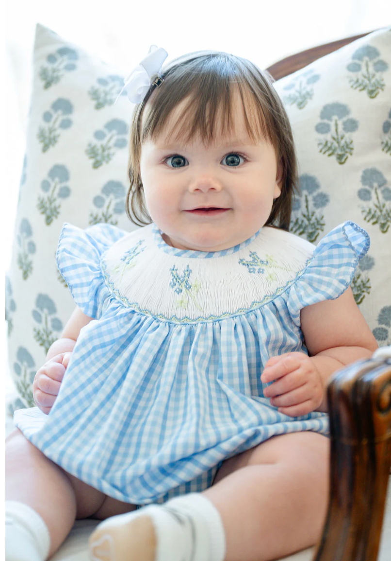 The Smocked Bluebonnet Bubble is a timeless favorite for baby girls ready to celebrate spring in classic style. This sweet bubble features blue gingham fabric with hand-smocked bluebonnets. It’s perfect for family photos, spring events, Easter celebrations, Mother’s Day, or enjoying sunny days.