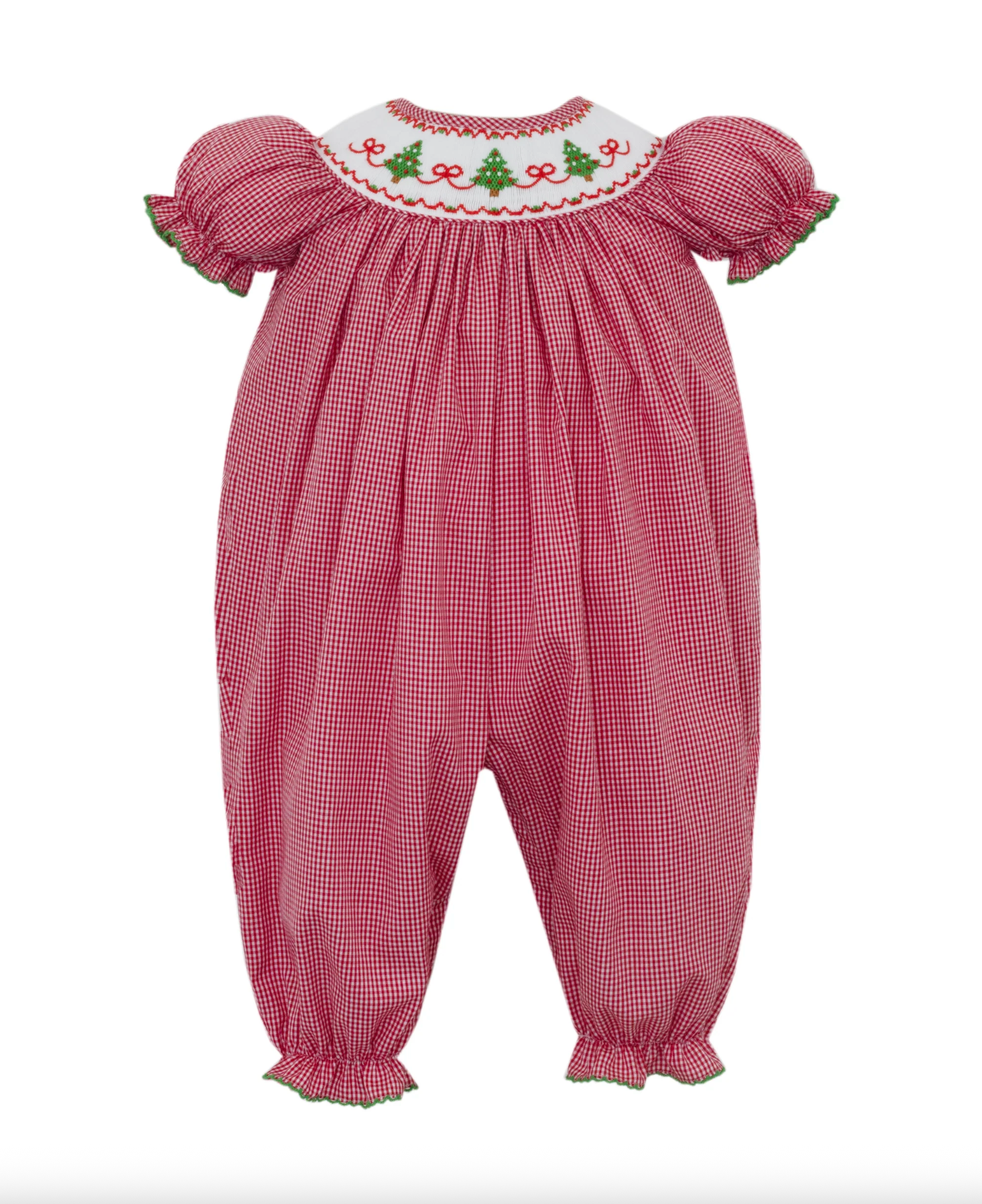These hand-smocked Christmas Trees feature delicate bows and are crafted in a classic Bishop-style long bubble silhouette. Made from vibrant red gingham fabric, they bring timeless holiday charm and refined detailing to your child’s wardrobe. Perfect for festive occasions, their intricate smocking and elegant design ensure both comfort and style throughout the season.