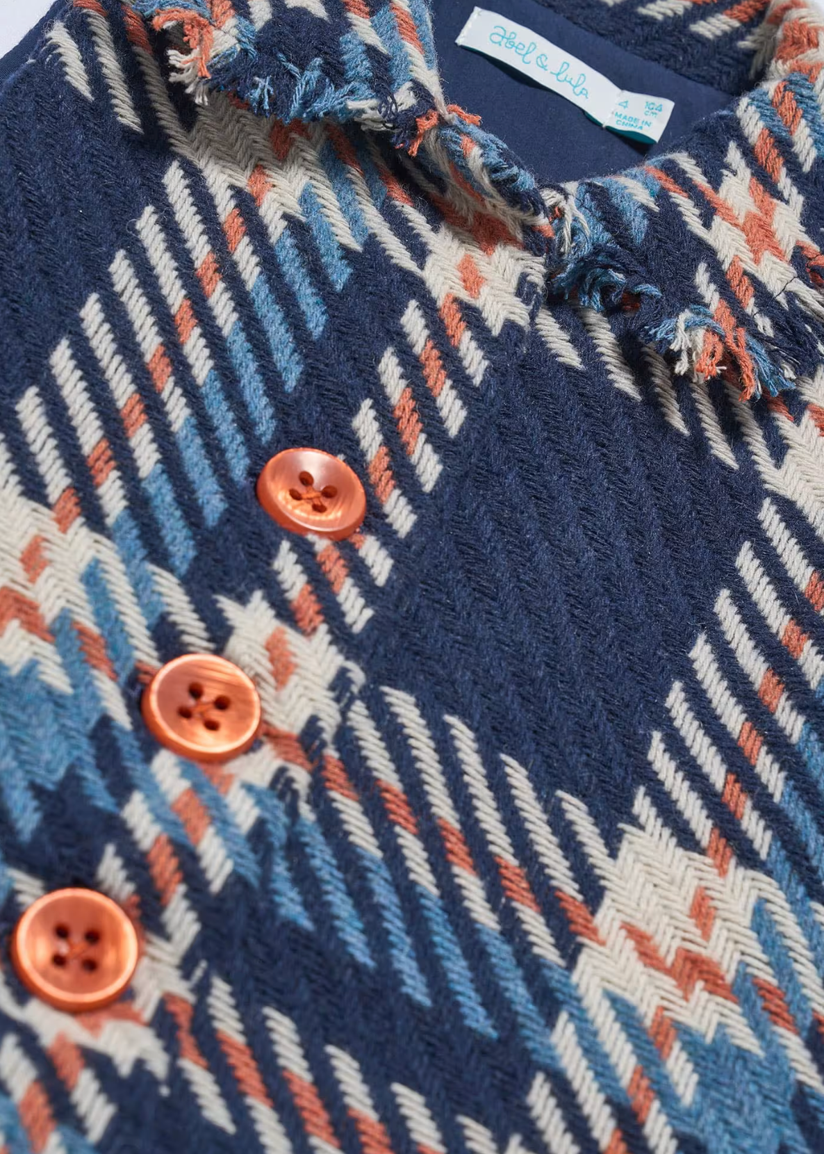 Girl's sleeveless vichy lurex plaid pinafore. Ruffle on the front finished with a pretty decorative button. Invisible back zip opening.