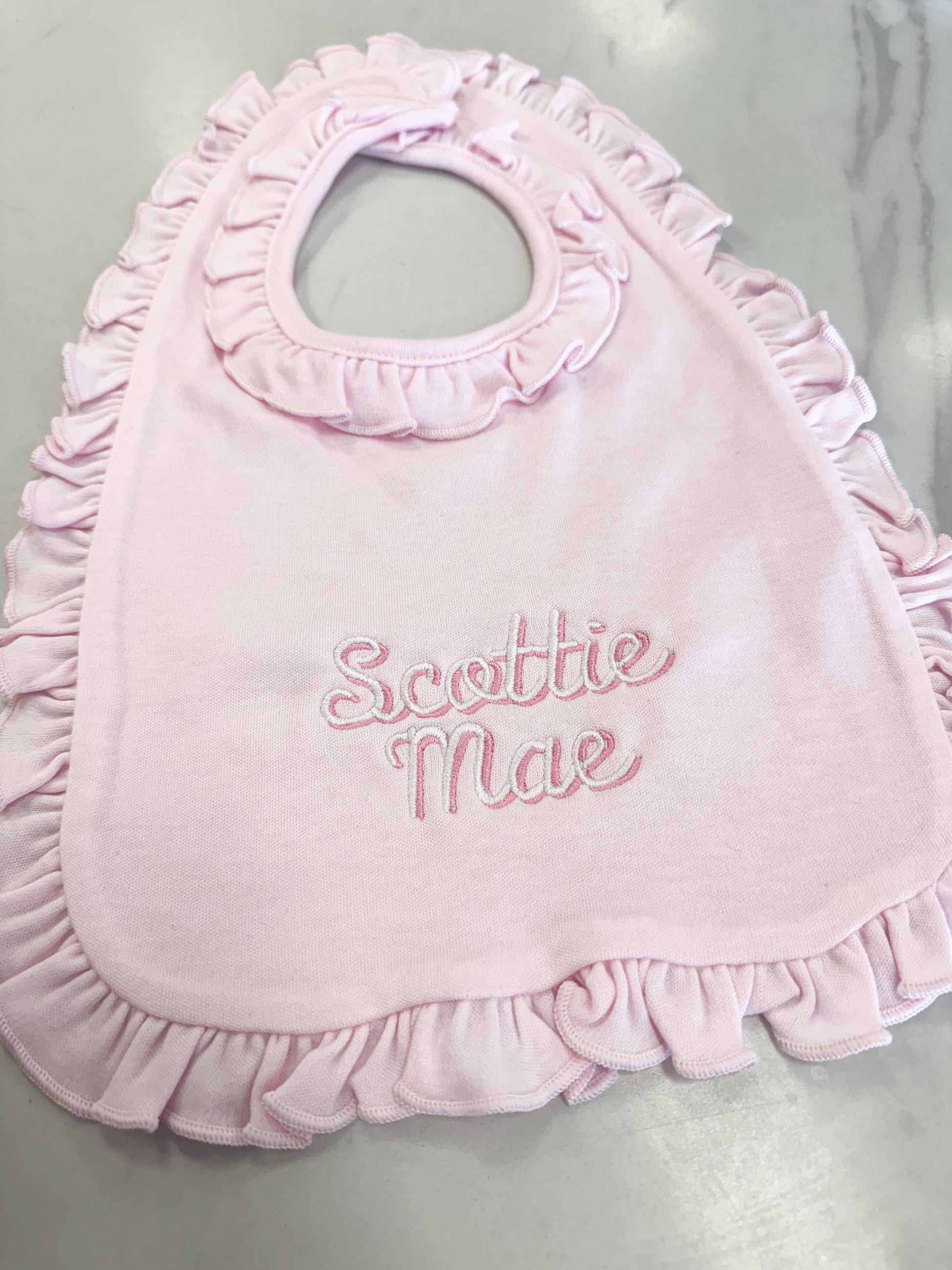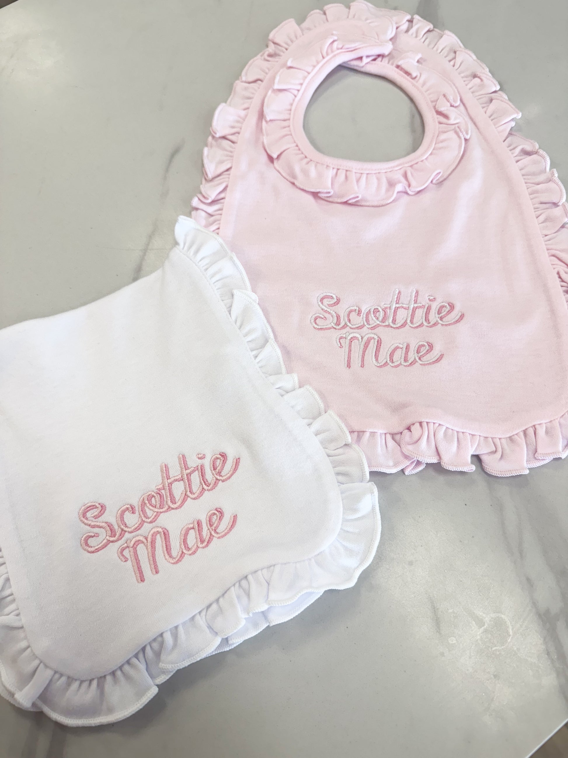 This charming two-piece set combines everyday practicality with heirloom-quality craftsmanship. Each piece features delicate embroidered detailing in soft pink and white tones, creating a sophisticated look that transitions seamlessly from nursery to gift presentation. The coordinated bib and burp cloth offer versatile coverage for feeding and protection, while the timeless design ensures these pieces remain cherished keepsakes for years to come. Perfect for new parents seeking both function and refined style.