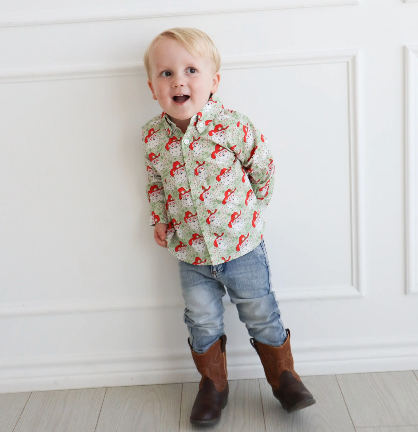 Get ready to saddle up for the cutest Christmas ever with the Ho Ho Howdy Santa William Shirt! Perfect for the cutest little cowboy in your life, this button-down shirt features a jolly Santa bringing festive cheer straight from the North Pole to the Wild West!
