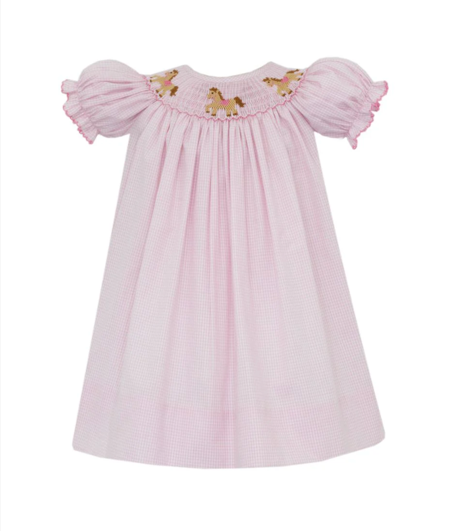 This pink gingham bishop dress features a classic silhouette with puffed sleeves and a loose, comfortable fit. Its charming embroidered horse detail adds a refined, whimsical touch, perfect for special occasions or everyday wear. Crafted for both style and comfort, this dress is an elegant choice that embodies timeless children's fashion.
