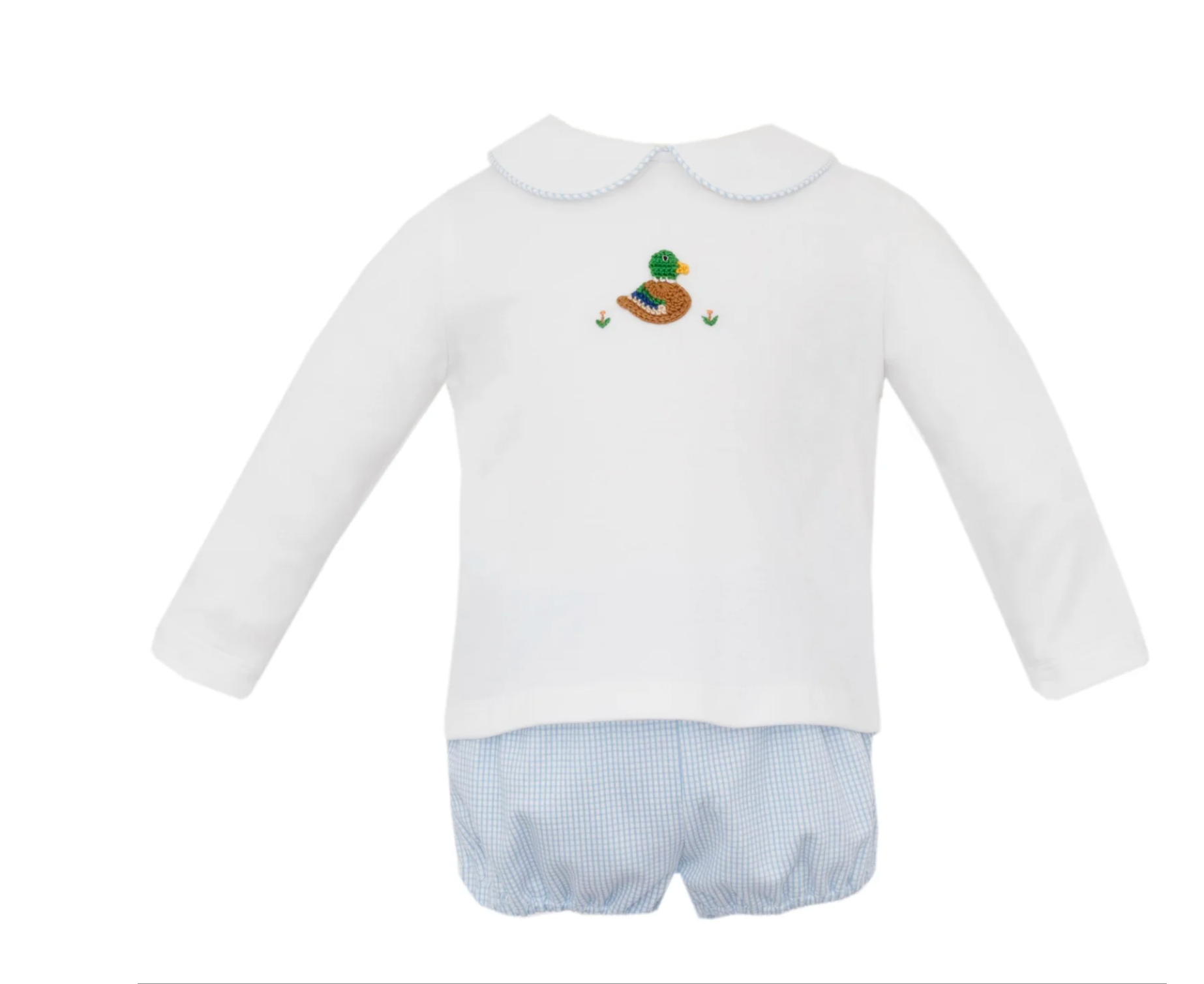 The Mallard Duck Knit Bloomer/Short Set features a playful long-sleeve top with a charming Peter Pan collar and a cute crochet mallard duck detail. Paired with blue check knit bloomers or shorts, this set offers a cozy and stylish outfit perfect for boys’ everyday adventures.