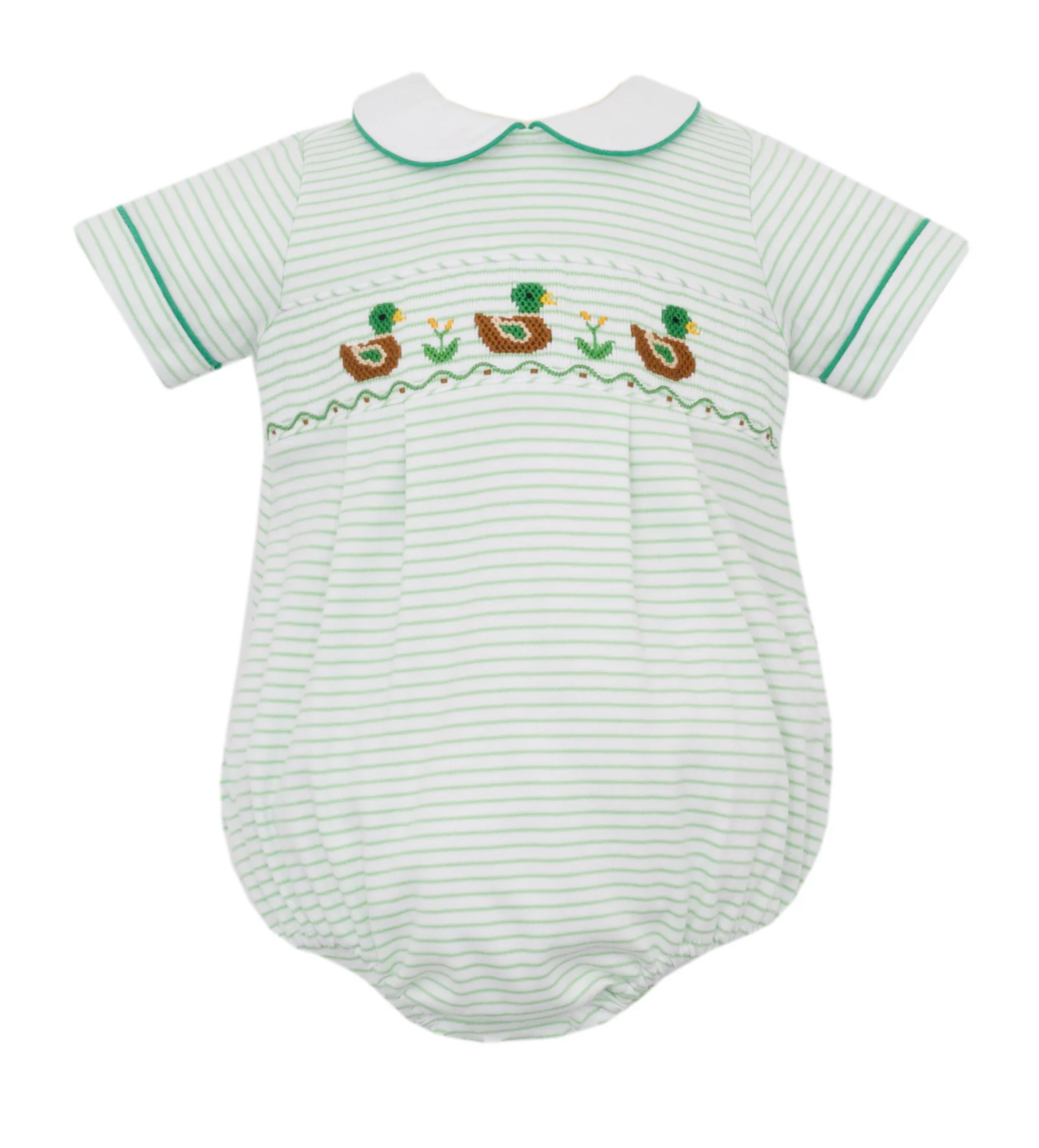 Crafted from 100% Pima cotton, the Mallard Smocked Bubble offers exceptional softness and breathability, ideal for delicate baby skin. Its classic green stripe design is complemented by detailed smocking, adding timeless elegance to this comfortable bubble romper. Perfect for keeping little ones cozy while allowing ease of movement.
