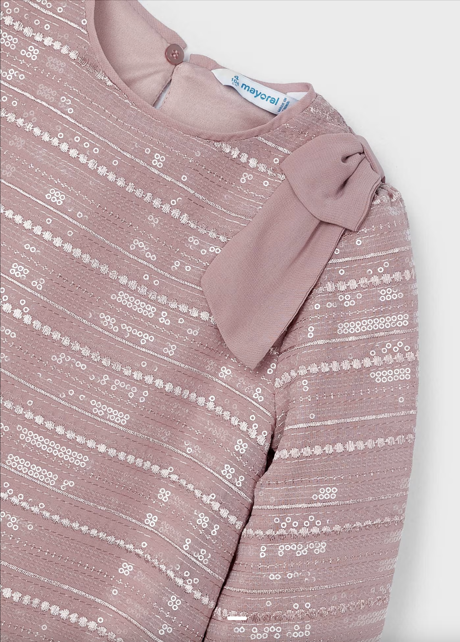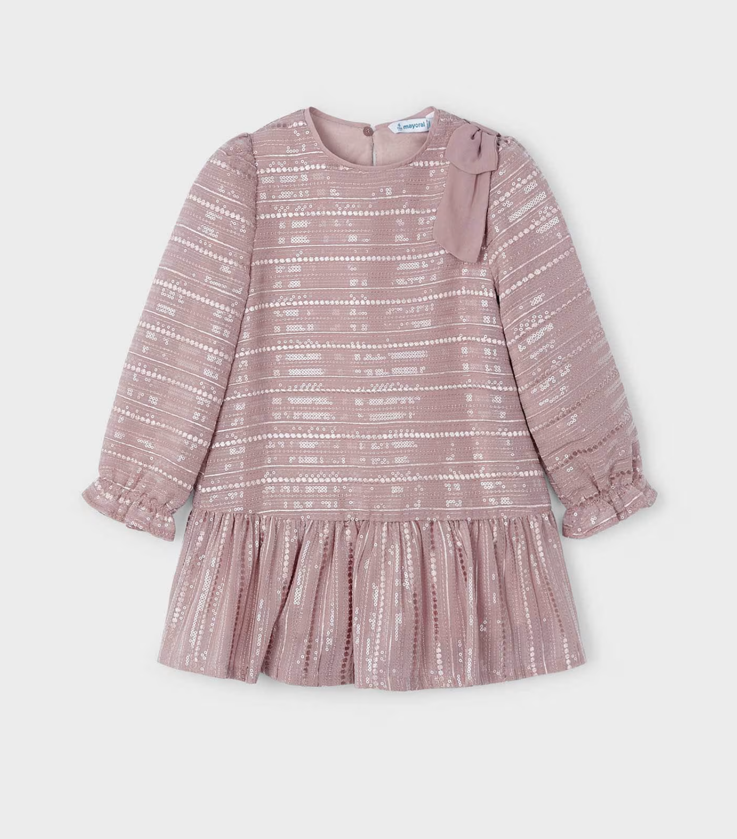This lovely long-sleeve dress for girls features elastic cuffs and is made from lightweight, flowy chiffon, ensuring comfort and ease of movement. The design includes a charming ruffle at the hem, along with decorative elements like a bow and sequins for a touch of sparkle. For safety reasons, decorative elements may vary in smaller sizes (2-3 years) to ensure a secure fit without compromising style.