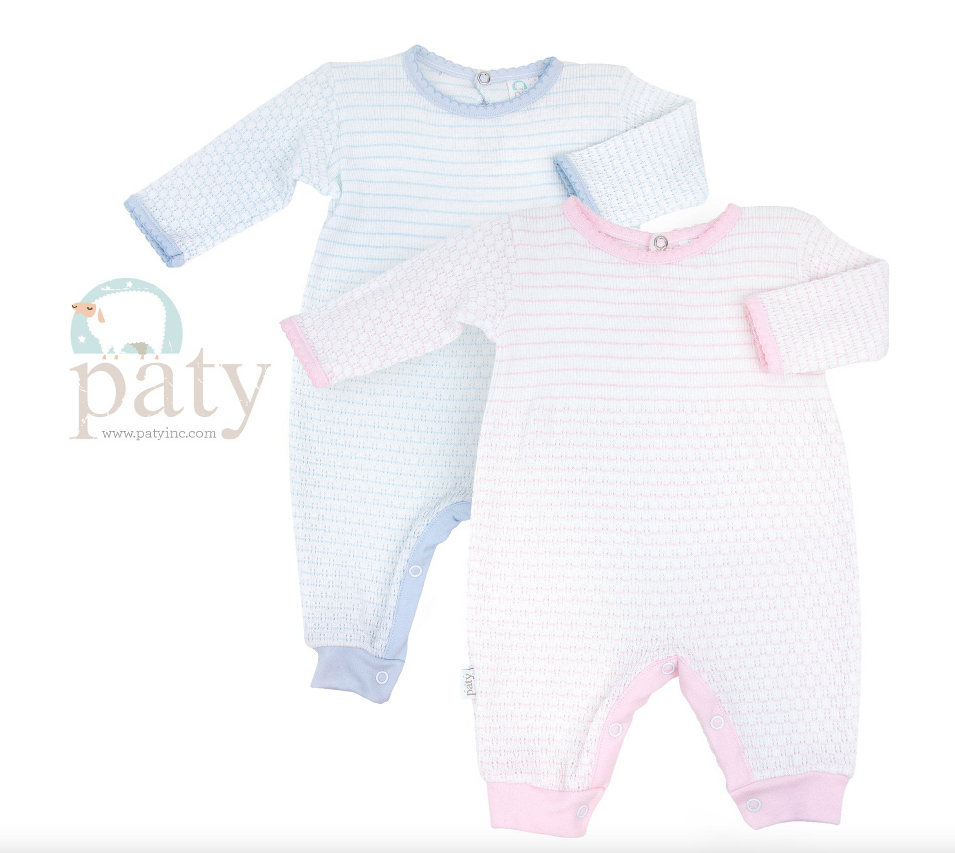 Pinstripe Romper by Paty in Pink Pinstripe with Pink Trim or Blue Pinstripe with Blue Trim
