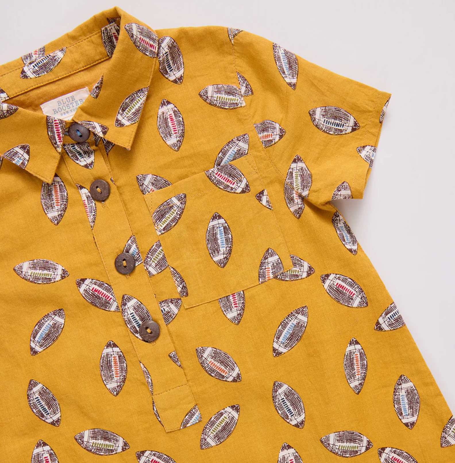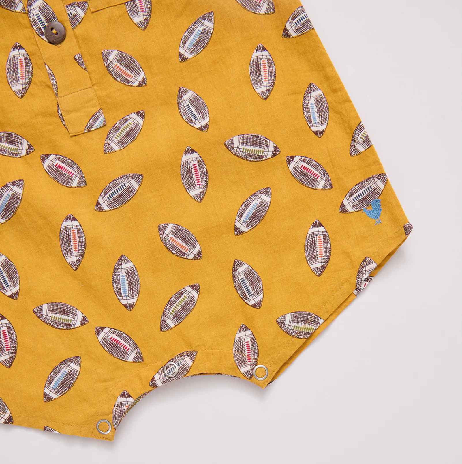 Friday Night Lights! Go out for a pass in this pep rally ready Baby Boys Easton Jumper crafted in the playful Flying Footballs print. Designer details on this handson one-piece include faux coconut buttons at the front and a pattern on pattern chest pocket. Ring snaps at the bottom allow for easy diapering.