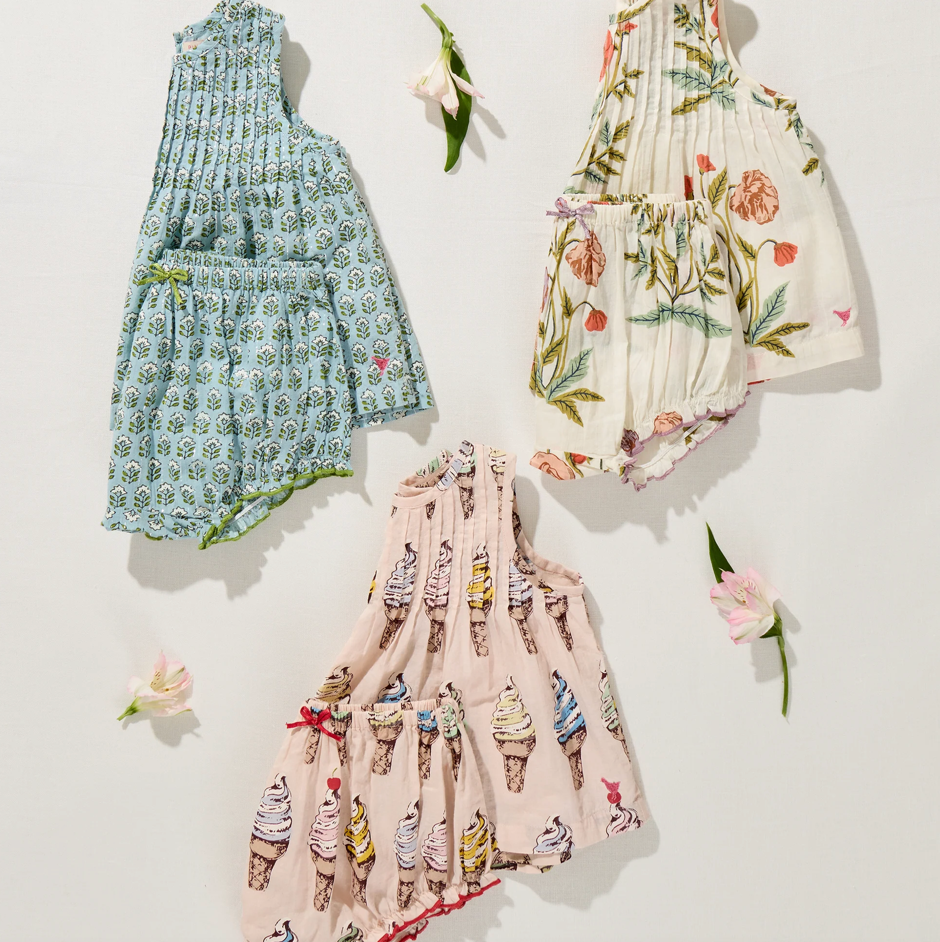Romantic floral meets baby-ready detail. The Jaipur 2-Piece Set in Rosewick Poppy features a soft top finished with coral glitter buttons and a coordinating diaper cover for easy wear. A purple satin bow and matching purple pearl stitching at the diaper cover leg openings add thoughtful contrast. Lightweight and breathable, this set blends sparkle with everyday practicality.