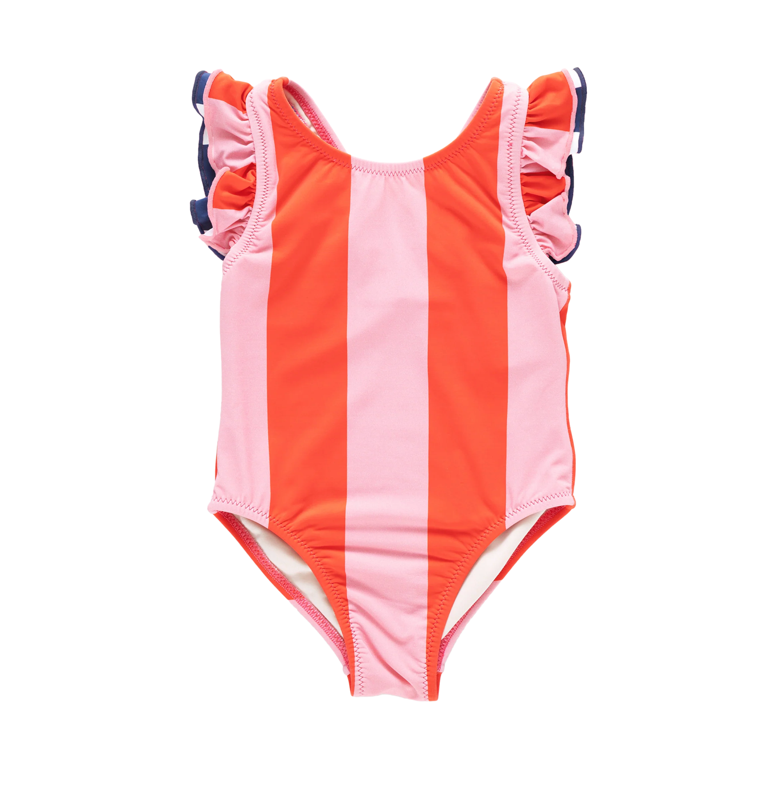 Playful stripe mixing gives this Liv Suit standout personality. The top ruffle features pink and red stripes trimmed with pink pearl stitching, while the bottom ruffle contrasts with navy and white stripes finished in navy pearl stitch. Diagonal back straps add a charming finishing detail.