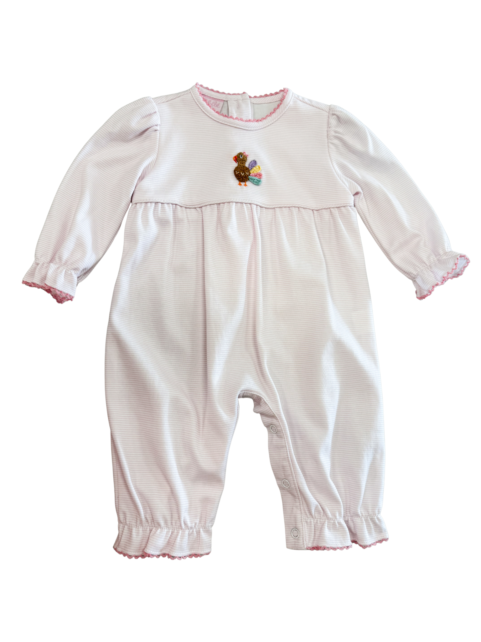 Crafted from 100% premium pima cotton, this light pink striped long romper offers exceptional softness and breathability for your child’s comfort. The hand-embroidered turkey detail adds a delicate, artisanal touch, combining quality craftsmanship with timeless style. Perfect for everyday wear, its gentle knit fabric ensures ease of movement while keeping your little one cozy.