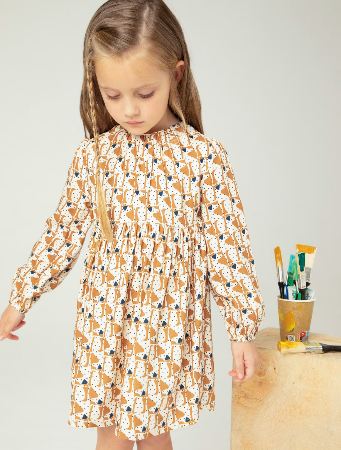 This cozy long-sleeve dress for girls features elastic cuffs and an invisible zip closure at the back for easy dressing. Made from warm and soft flannel fabric, it ensures comfort during cooler days. The dress showcases a lovely printed design, making it a stylish choice for any occasion while providing warmth and ease.
