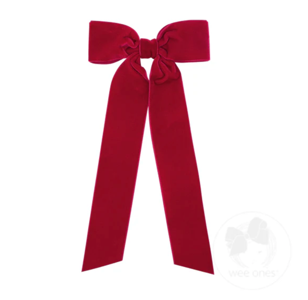This adorable medium velvet bowtie is the perfect accessory for little girls looking for a fashionable, sassy look! The plain wrap and 9 inch streamer tails give this bowtie a perfect balance of sophistication and fun — adding a touch of pizzazz to any outfit! These bows are sure to stay in her hair all day with our patented WeeStay™ no-slip hair clip.