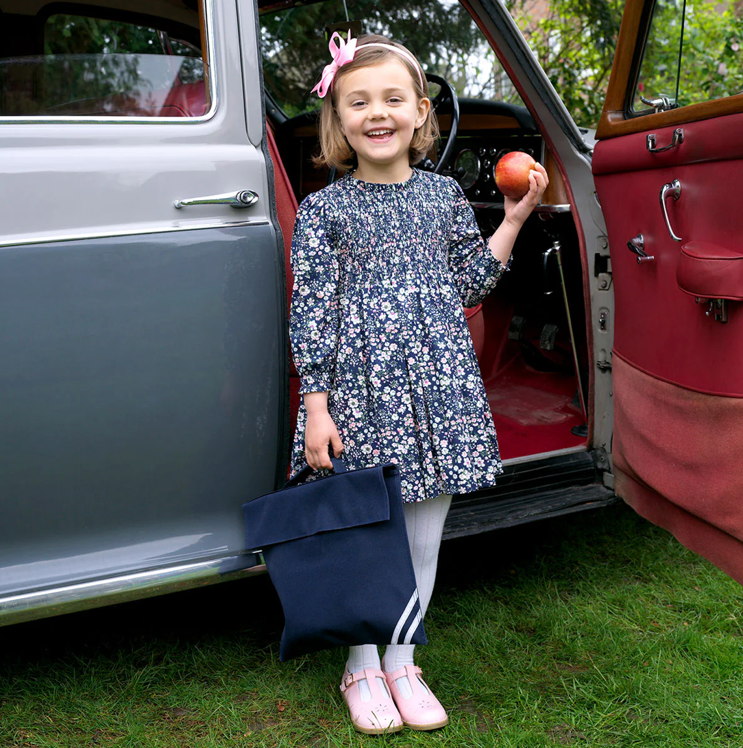 Your little one will look like a charming princess in this Rose Ruched Frill Dress! This winter dress features a beautiful floral print in soft pink and cream on a navy background. The ruched bodice, elasticated puff sleeves, and gathered skirt add a playful touch. Fully lined and with a button back opening for easy wear.