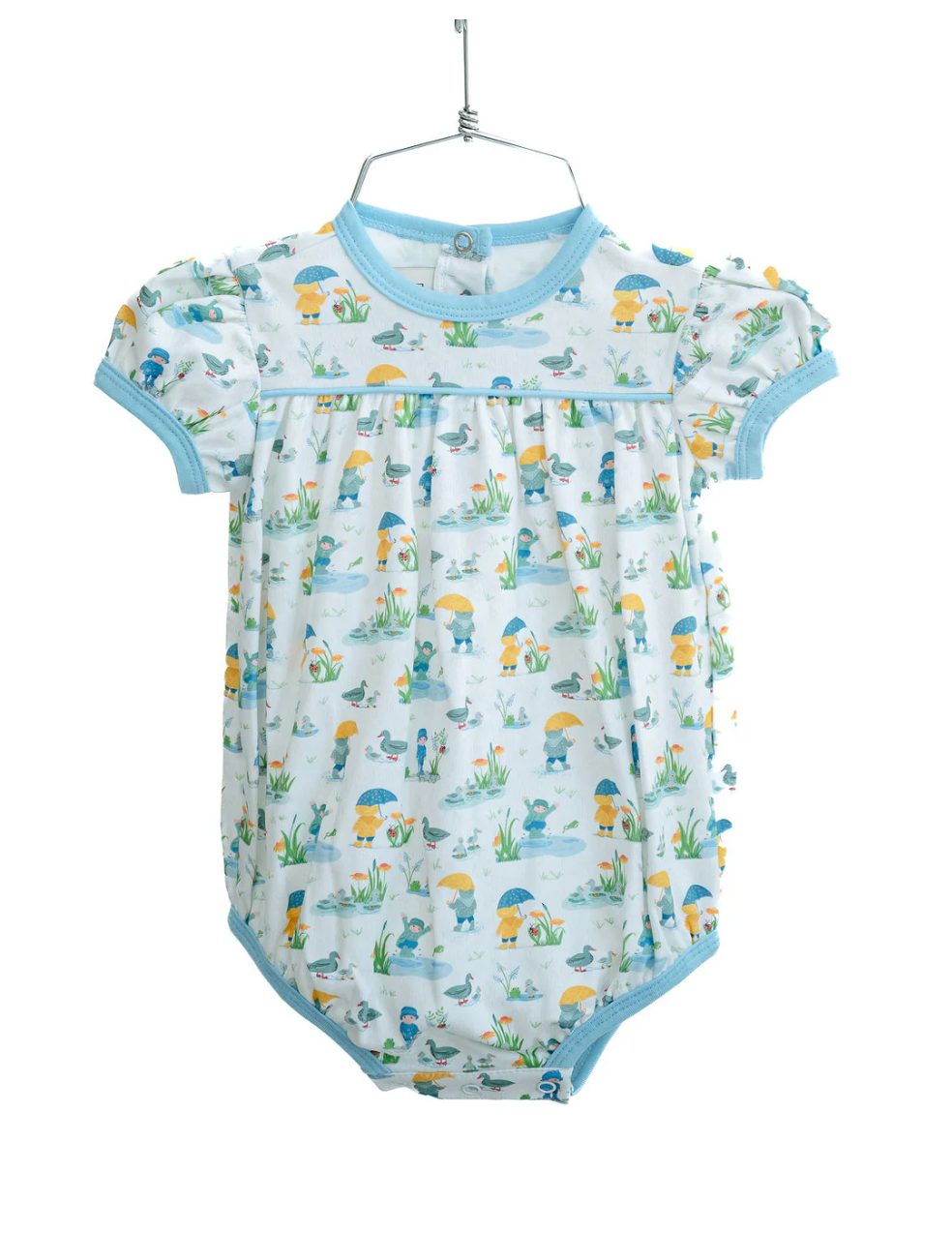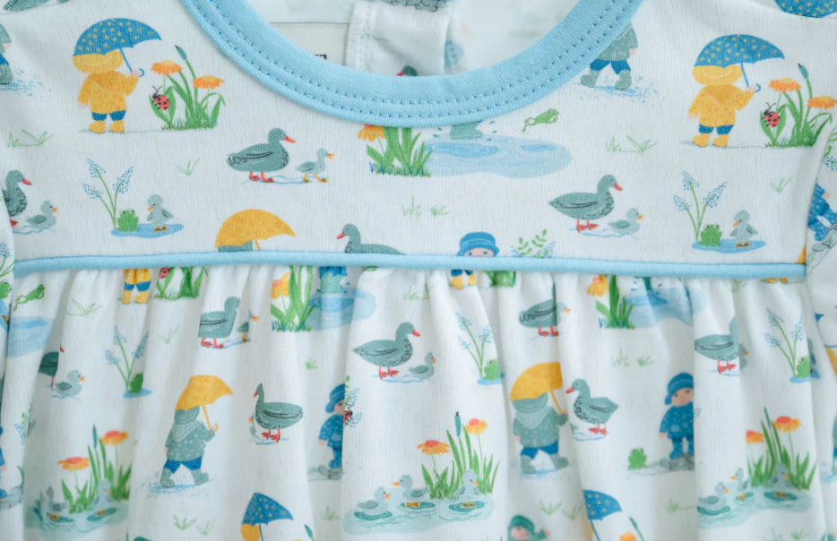 The Splashing Puddles Pima Bubble is full of playful springtime fun for baby and toddler girls. Made from 100% soft pima cotton, it features a whimsical rain scene print with ducks, umbrellas, and puddles accented with blue details. It’s perfect for springtime play, outdoor adventures, or casual family outings.