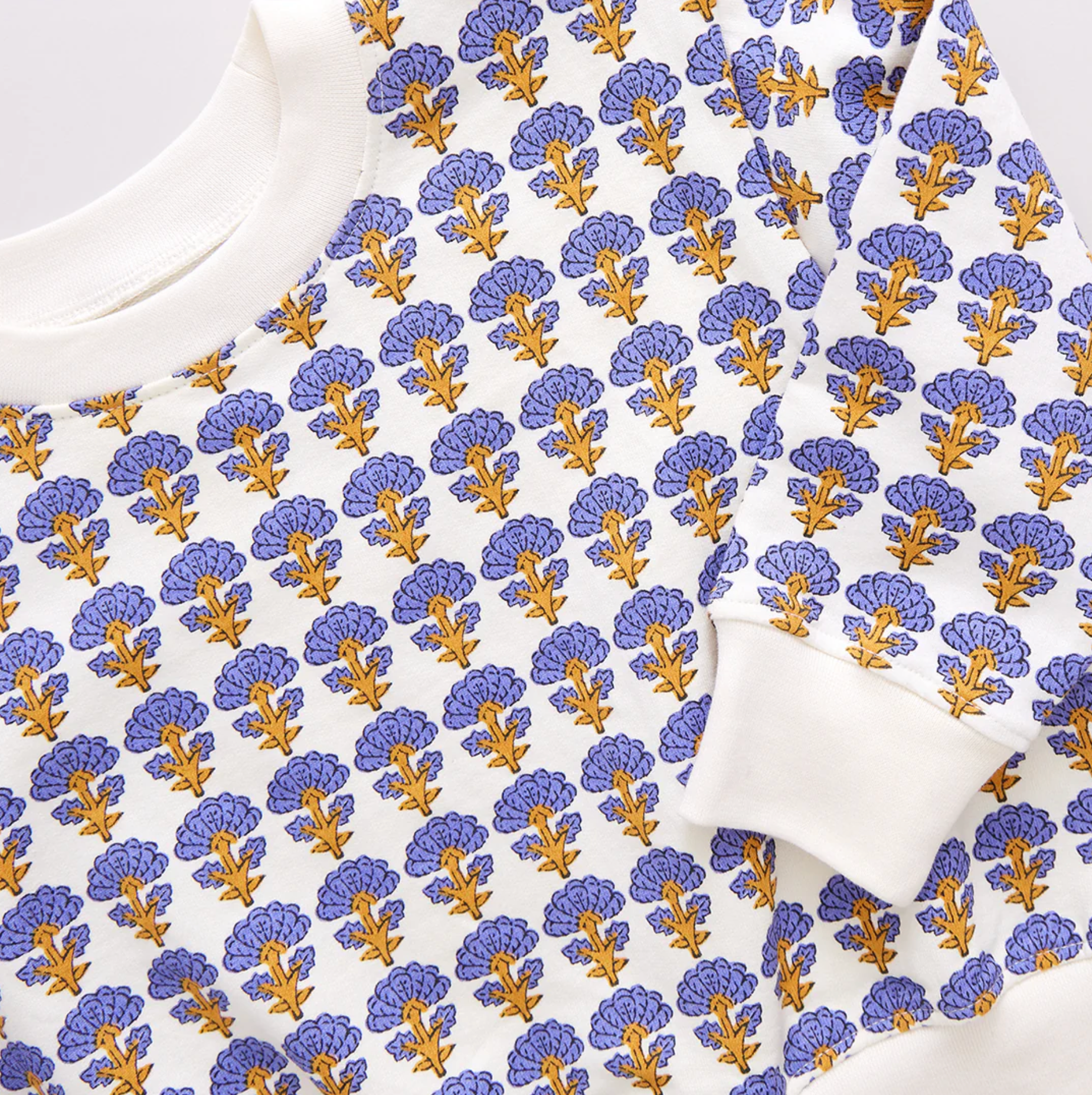 Boho Vibes! A cornflower blossom crowns a golden stem in our traditional Indian block print Stamp Flower, shown here on our classic and cozy Girls Organic Sweatshirt. This flock favorite crewneck style features a boxy fit and wide cream cuffs and waistband giving this wear-everywhere piece a stylish flare. Pair with our Girls Organic Sweatpant for a complete look. Loomed in GOTS-certified organic cotton with a touch of stretch for a comfortable fit. Our inks and dyes are classified eco-friendly by OKEO-TEX criteria.