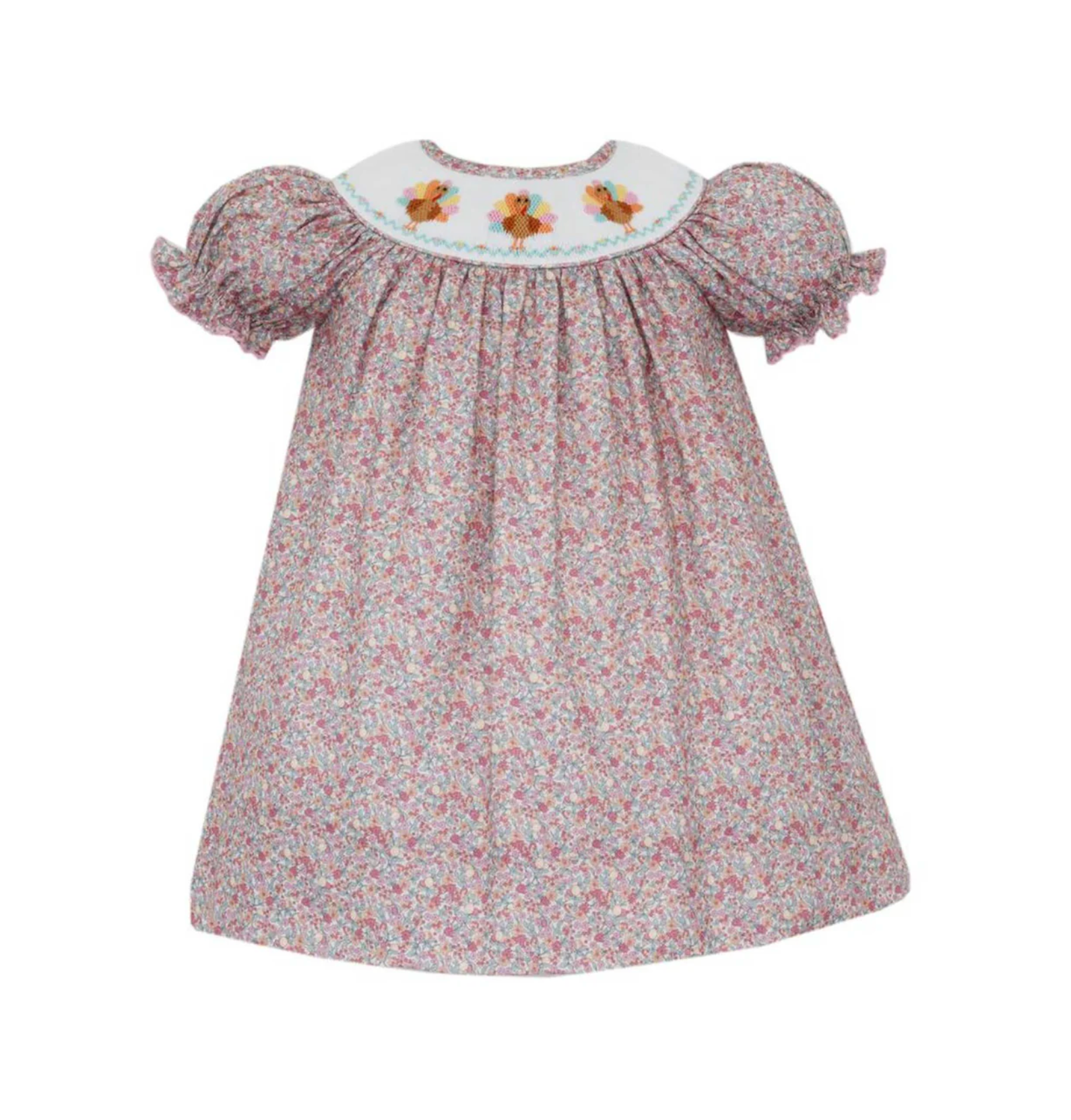 This charming smocked dress showcases a sweet floral pattern adorned with pastel turkeys on a classic bishop neckline and cute short puff sleeves. Ideal for playdates, school events, or family celebrations, it brings a touch of whimsy to your little one's fall wardrobe. Make this delightful dress a fun and stylish addition to their seasonal favorites!