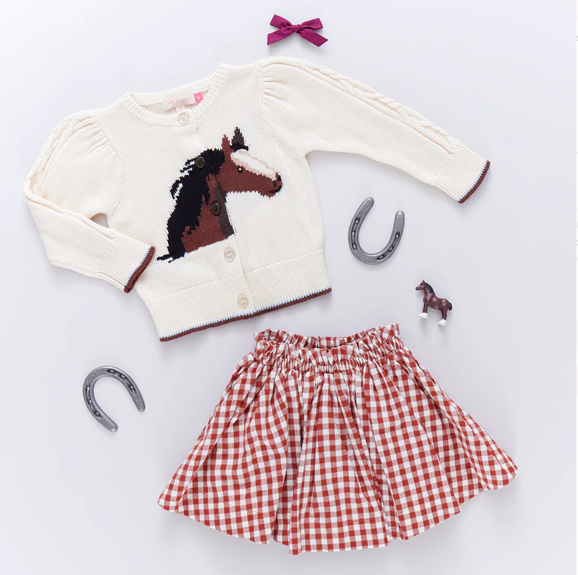 Pretty Pony! This classic cardigan shape features a soft gathered puff shoulder with a generous cable knit down the sleeve, a subtle yet sparkly cream and brown glitter button front closure and discreet blue and brown stripes at the sleeves and hem. Your little equestrian will love this piece! Match with our Baby Girls Cable Constance Sweater for Big Sis / Little Sis horse show ready look.
